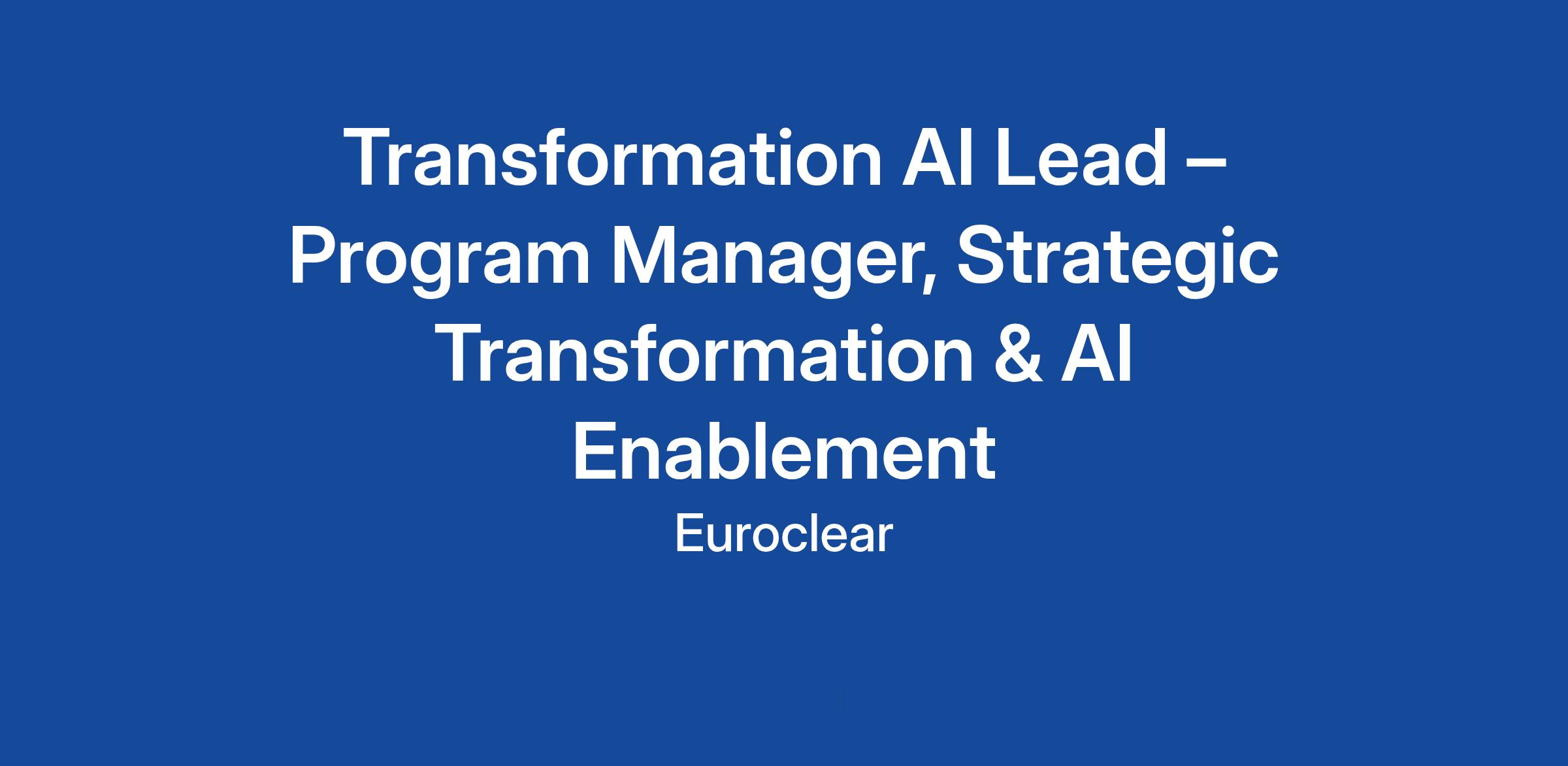 Euroclear is committed to building a diverse, equitable, and inclusive workplace as we transform into a truly AI-enabled financial market infrastructure (FMI). We are seeking a tech-savvy, hands-on Transformation AI Lead to drive a high-paced, multi-dimensional transformation program. This role blends strategic program management, inclusive leadership, and AI integration expertise. The ideal candidate will champion complex change across Euroclear’s ecosystem, ensuring alignment with our strategic priorities and fostering a culture of belonging and innovation.